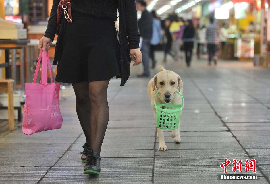 A dog runs behind its owner and carries its owner’s basket in a street of Chongqing on Oct. 29. (Chinanews.com/Chen Chao)