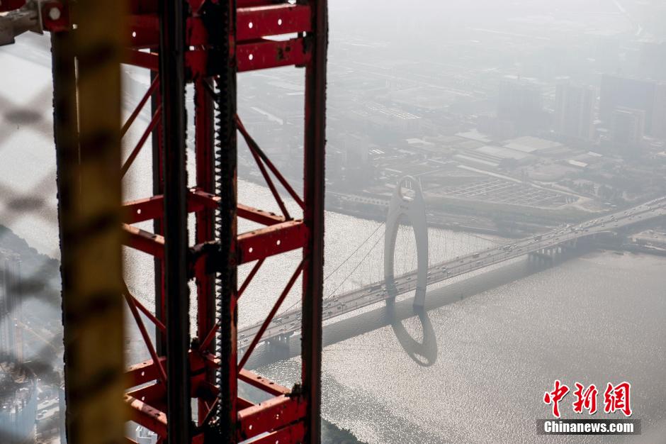 The construction of 530-meter Guangzhou Chow Tai Fook Financial Center, namely East Tower, completes on Oct.28, 2014. (CNS/Long Yuyang)