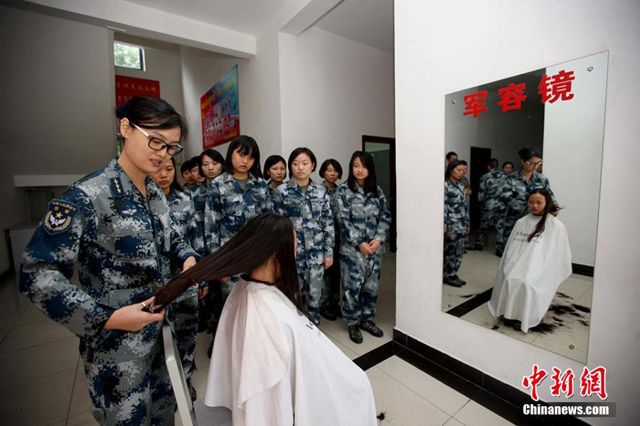 New recruits line up to do haircuts. (China News Agency/Yi Kaihong)
