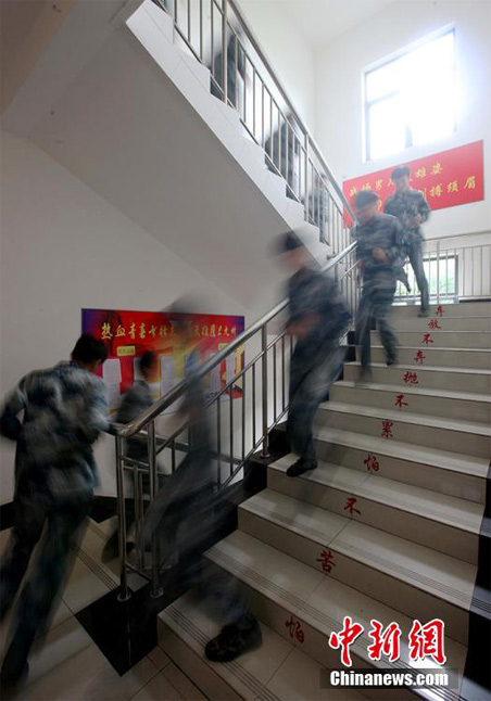New recruits exercise an emergency muster. (China News Agency/Yi Kaihong)
