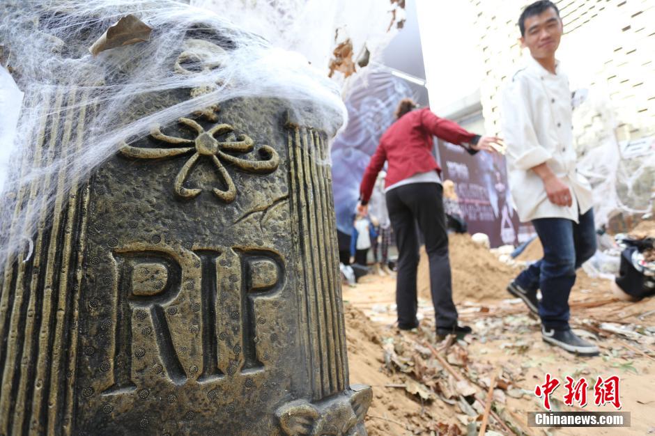 Grave mounds appear in front of a KTV in Zhengzhou, Henan Province. (CNS/Yang Zhenghua)
