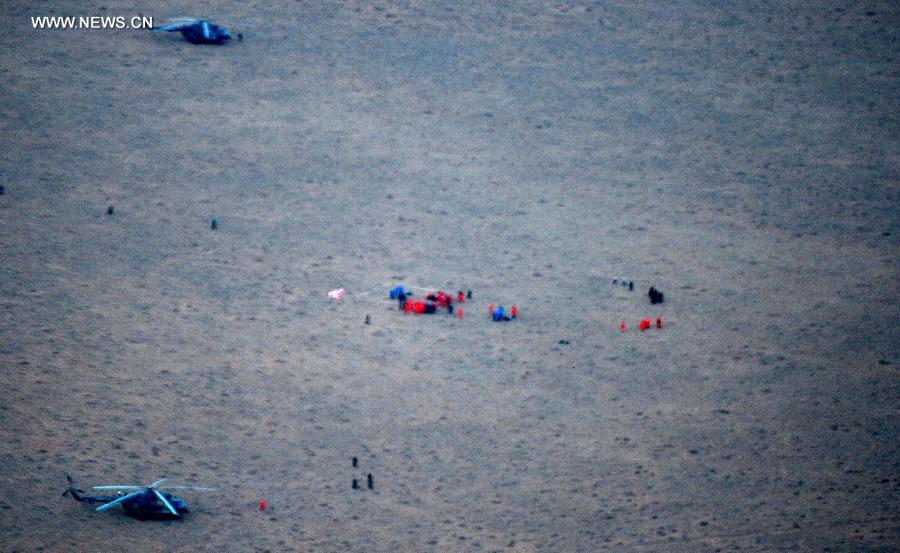 Researchers retrieve the return capsule of China's unmanned lunar orbiter in the central region of north China's Inner Mongolia Autonomous Region, Nov. 1, 2014. Return capsule of China's test lunar orbiter landed successfully early Saturday morning in north China's Inner Mongolia Autonomous Region, according to the Beijing Aerospace Control Center. (Xinhua/Ren Junchuan)