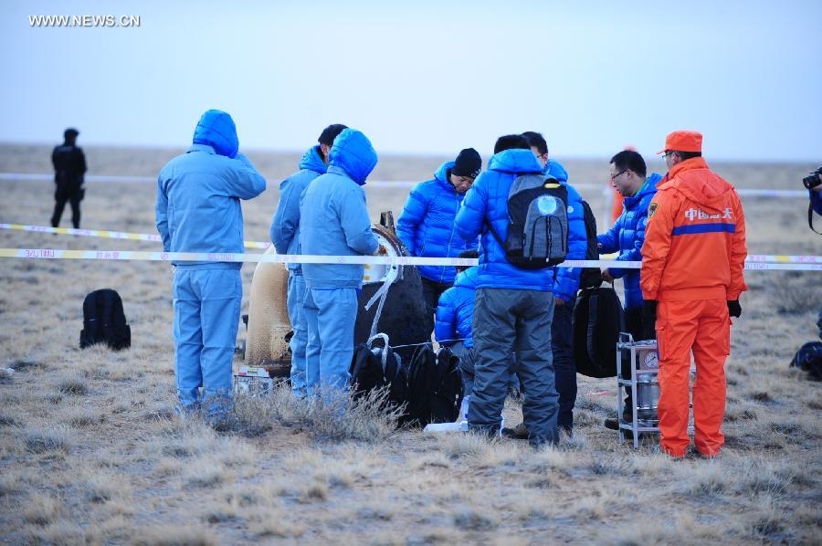 Researchers retrieve the return capsule of China's unmanned lunar orbiter in the central region of north China's Inner Mongolia Autonomous Region, Nov. 1, 2014. Return capsule of China's test lunar orbiter landed successfully early Saturday morning in north China's Inner Mongolia Autonomous Region, according to the Beijing Aerospace Control Center. (Xinhua/Shao Kun)