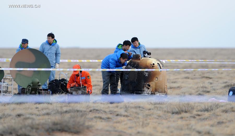 Researchers retrieve the return capsule of China's unmanned lunar orbiter in the central region of north China's Inner Mongolia Autonomous Region, Nov. 1, 2014. Return capsule of China's test lunar orbiter landed successfully early Saturday morning in north China's Inner Mongolia Autonomous Region, according to the Beijing Aerospace Control Center. (Xinhua/Zhang Ling)