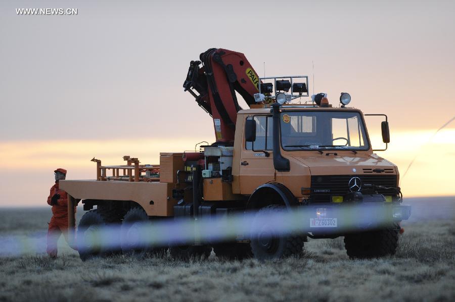 Researchers retrieve the return capsule of China's unmanned lunar orbiter in the central region of north China's Inner Mongolia Autonomous Region, Nov. 1, 2014. Return capsule of China's test lunar orbiter landed successfully early Saturday morning in north China's Inner Mongolia Autonomous Region, according to the Beijing Aerospace Control Center. (Xinhua)