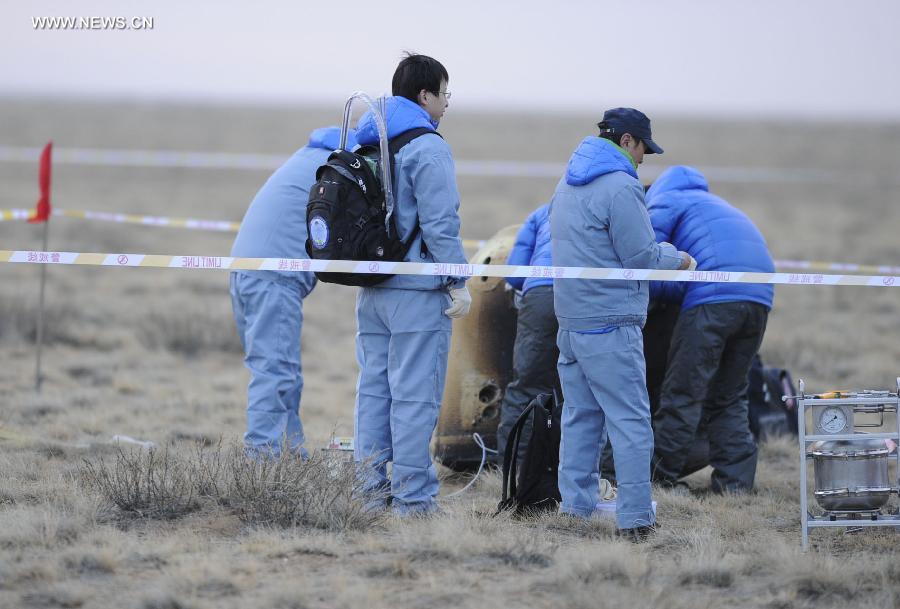Researchers retrieve the return capsule of China's unmanned lunar orbiter in the central region of north China's Inner Mongolia Autonomous Region, Nov. 1, 2014. Return capsule of China's test lunar orbiter landed successfully early Saturday morning in north China's Inner Mongolia Autonomous Region, according to the Beijing Aerospace Control Center. (Xinhua/Shao Kun)