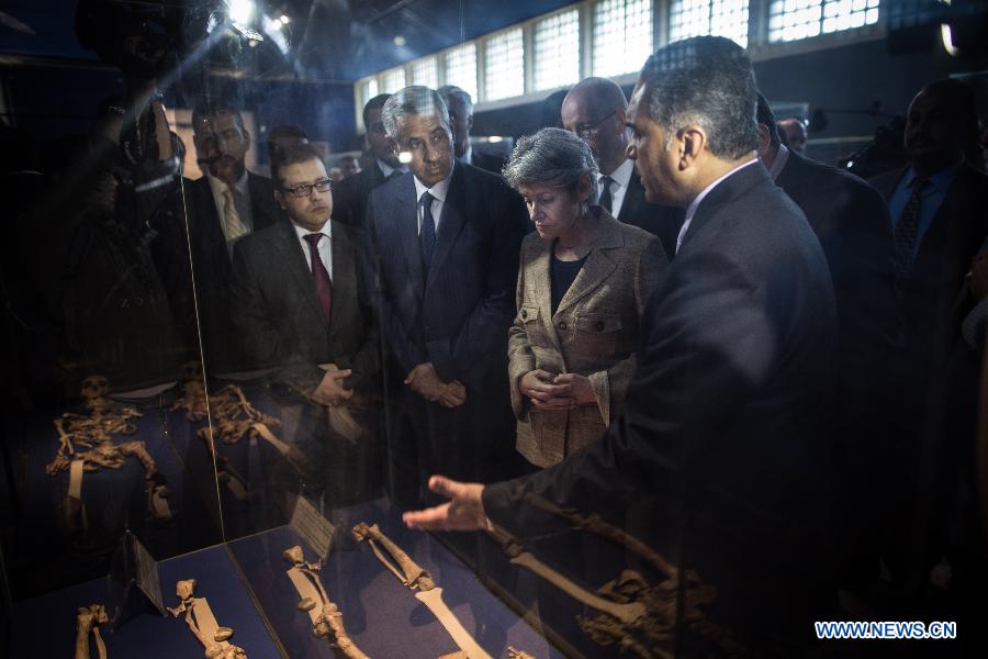 Irina Bokova (C), Director General of UNESCO, visits the Iraqi National Museum in the Iraqi capital of Baghdad on Nov. 2, 2014. Bokova on Sunday voiced support for the Iraqi government against "barbaric" destruction of the Iraqi cultural heritage, as the Islamic State (IS) militant group destroyed several ancient sites in the country. (Xinhua/Chen Xu)