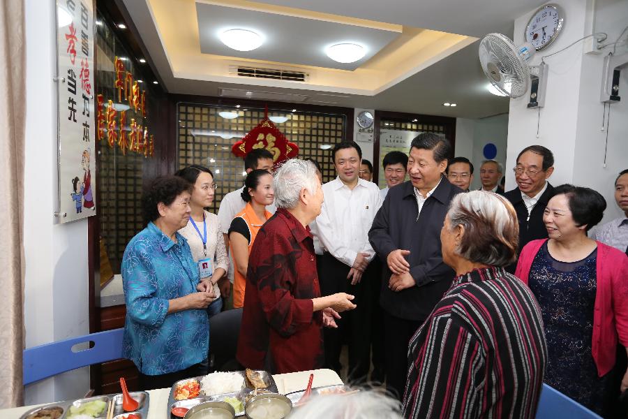 Chinese President Xi Jinping (center R) talks with the elderly at a service station for the aged in the Junmen Community in Fuzhou, capital of southeast China's Fujian Province, Nov. 1, 2014. Xi made an inspection tour to southeast China's Fujian Province on Nov. 1 and 2. (Xinhua/Lan Hongguang)