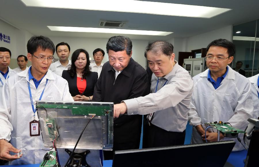 Chinese President Xi Jinping (C) visits a laboratory of the Newland Group, a high-tech company, in Fuzhou, capital of southeast China's Fujian Province, Nov. 1, 2014. Xi made an inspection tour to southeast China's Fujian Province on Nov. 1 and 2. (Xinhua/Lan Hongguang)