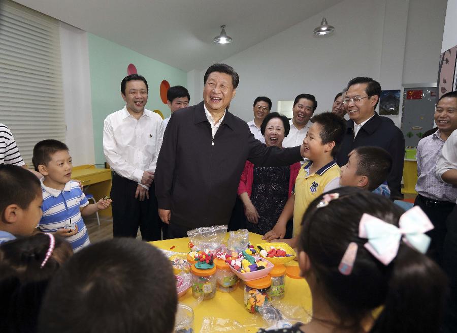 Chinese President Xi Jinping (C) talks with children in the Junmen Community in Fuzhou, capital of southeast China's Fujian Province, Nov. 1, 2014. Xi made an inspection tour to southeast China's Fujian Province on Nov. 1 and 2. (Xinhua/Lan Hongguang)