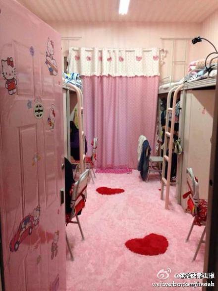 Four freshmen of one Art College turned their dormitory into a pink castle with the theme of 'Hello kitty" in southwest Sichuan Province recently.