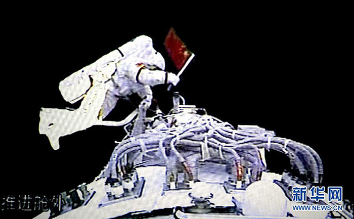 Zhai Zhigang, astronaut of Shenzhou 7 spacecraft waves Chinese flag on Sept. 27, 2008. (Xinhua/Cha Chunming)