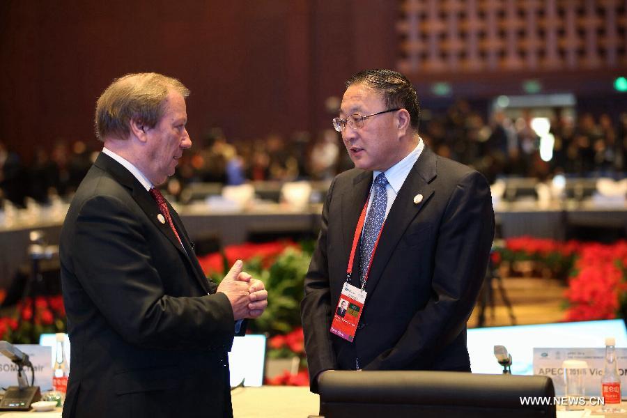 Two senior officials talk before the opening of the Asia-Pacific Economic Cooperation (APEC) 2014 Concluding Senior Officials Meeting (CSOM) at China National Convention Center in Beijing, capital of China, Nov. 5, 2014. The APEC 2014 CSOM will be held here from Nov. 5 to 6. (Xinhua/Jin Liwang)