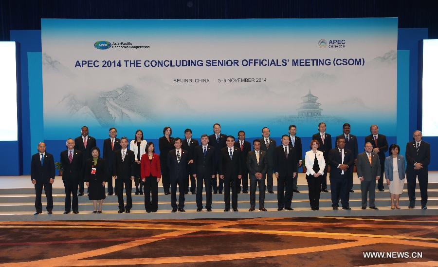 Officials attending the Asia-Pacific Economic Cooperation (APEC) 2014 Concluding Senior Officials Meeting (CSOM) pose for a group picture at China National Convention Center in Beijing, capital of China, Nov. 5, 2014. The APEC 2014 CSOM is held here from Nov. 5 to 6. (Xinhua/Jin Liwang)