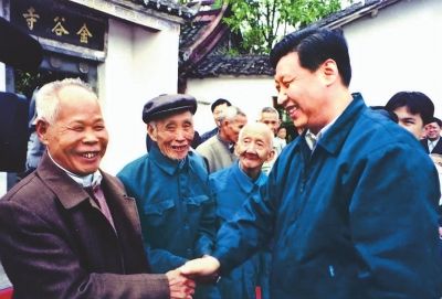 Photo taken in November 1999 shows Xi Jinping, then Deputy Party Secretary and acting Governor of Fujian, visiting seniors at Jingu Temple, site of the Yongding Uprising. (Photo source: Fujian Daily)