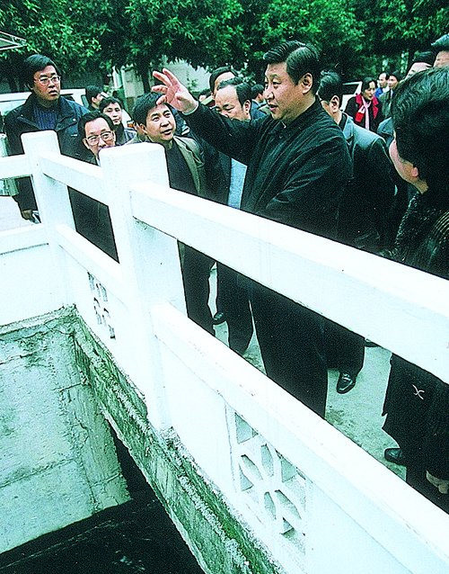 Photo taken in February 2001 shows Xi Jinping, then Governor of Fujian, inspecting Pingxi River in Fuzhou, Fujian province.