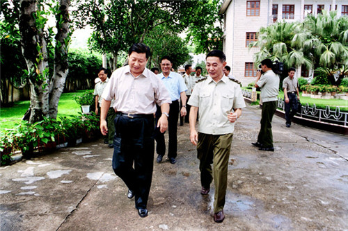 Photo taken in June 2002 shows Xi Jinping, then Deputy Party Secretary and Governor of Fujian, helping to solve problems at an on-site ‘office' in the 31st Group Army. (Photo source: PLA Pictorial)