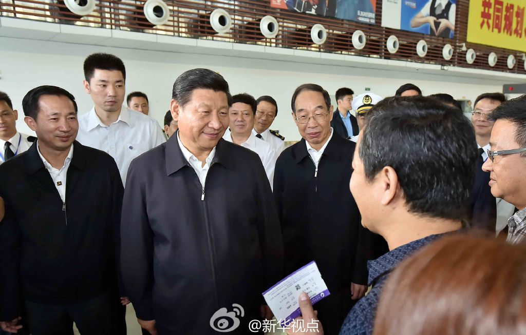 Chinese President Xi Jinping talks with tourists who are about to leave for southeast China's Taiwan at the Pingtan Strait Ferry Terminal in Pingtan, Fujian province, Nov. 1, 2014. (Photo source: Weibo account of Xinhua Shi Dian)