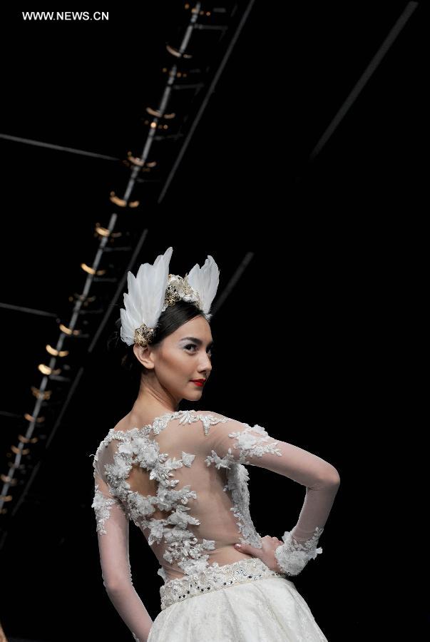 A model presents a creation by Indonesian designer Dominique Nadine during the Jakarta Fashion Week 2015 in Jakarta, Indonesia, Nov. 5, 2014. (Xinhua/Agung Kuncahya B.)
