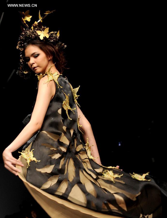 A model presents a creation by Indonesian designer Dominique Nadine during the Jakarta Fashion Week 2015 in Jakarta, Indonesia, Nov. 5, 2014. (Xinhua/Agung Kuncahya B.)