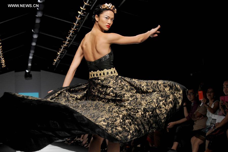 | A model presents a creation by Indonesian designer Dominique Nadine during the Jakarta Fashion Week 2015 in Jakarta, Indonesia, Nov. 5, 2014. (Xinhua/Agung Kuncahya B.) |