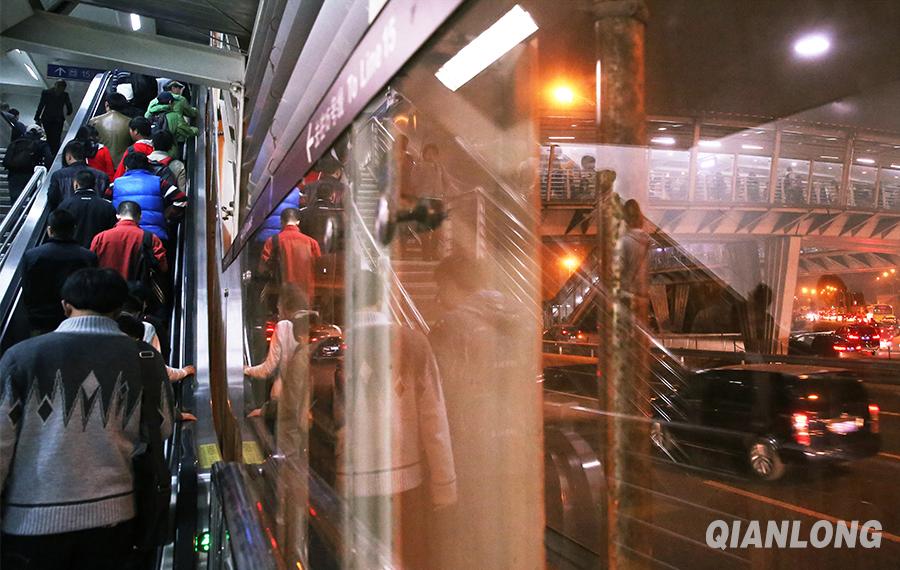 Wangjingxi is the transfer station of Line 13 and Line 15. People take the escalator to go across the pedestrian bridge. (Qianlong.com/Wang Zibin)