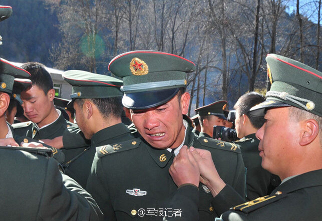 Soldiers are grieved to bid farewell to their military ranks and guns when are discharged from active duty. (Photo/Official Micro-blog of Junbao Jizhe)