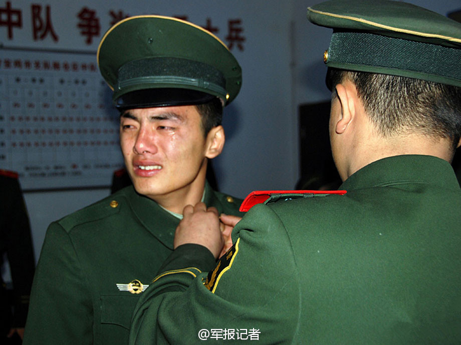 Soldiers are grieved to bid farewell to their military ranks and guns when are discharged from active duty. (Photo/Official Micro-blog of Junbao Jizhe)