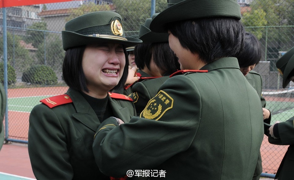 Soldiers are grieved to bid farewell to their military ranks and guns when are discharged from active duty. (Photo/Official Micro-blog of Junbao Jizhe)