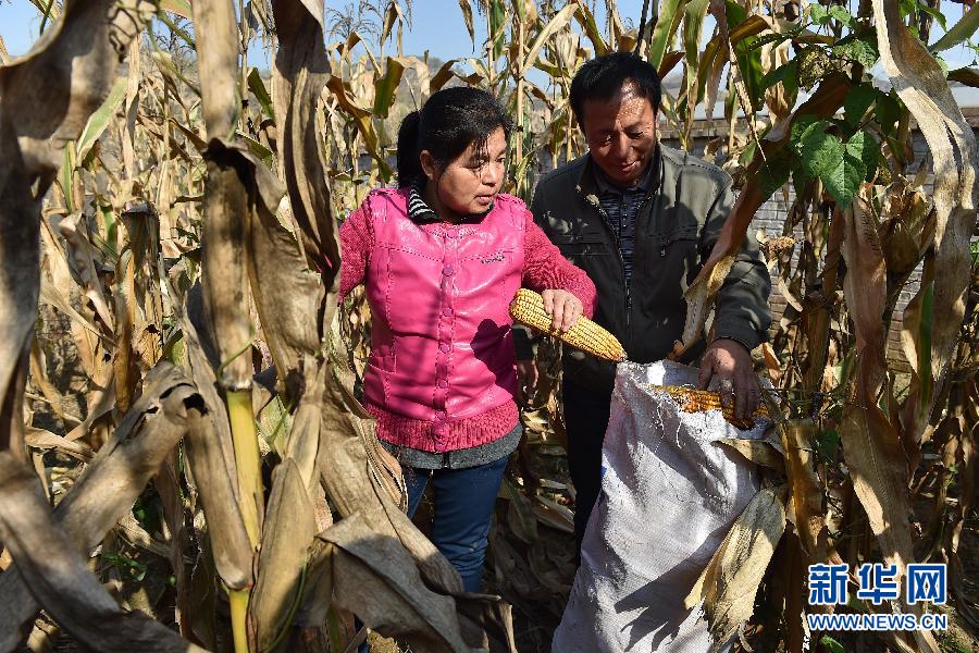 Li and her husband Han Dengwen pick corns on Oct. 22, 2014. (Xinhuanet/Zhan Yan)