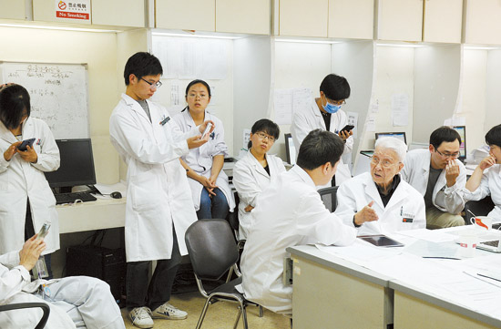 Zhang discusses research subjects with doctors of oncology department.