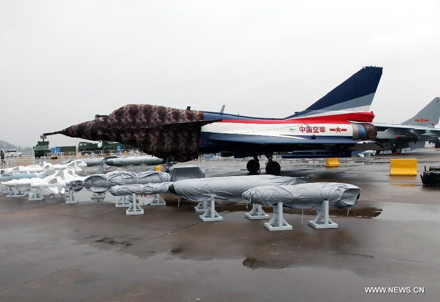 Photo taken on Nov. 8, 2014 shows a J-10 fighter made by China parking at the apron ahead of the 10th China International Aviation and Aerospace Exhibition in Zhuhai, south China's Guangdong Province. Some 700 exhibitors at home and abroad with 130-plus planes will attend the six-day airshow from November 11 to 16. (Xinhua/Pang Jie)
