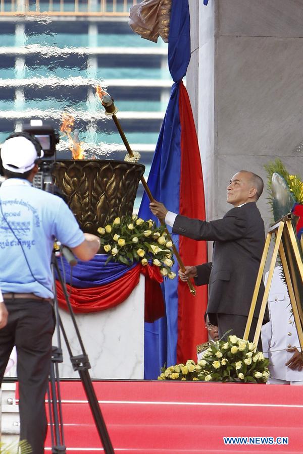 Cambodian King Norodom Sihamoni (R) lights the victory torch at the Independence Monument in Phnom Penh, Cambodia, Nov. 9, 2014. Cambodia marked the 61st anniversary of the declaration of the Independence Day from French protectorate on Sunday. (Xinhua/Phearum)