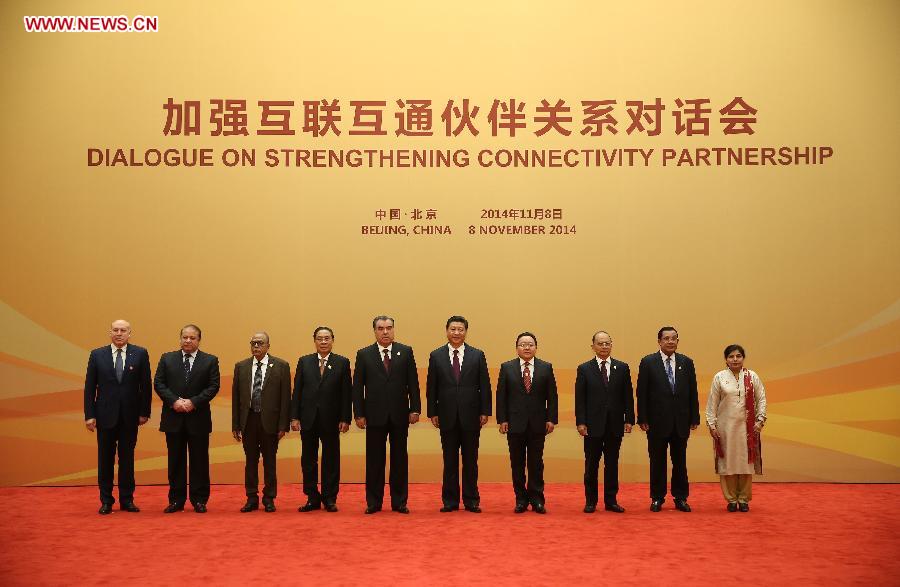 Chinese President Xi Jinping poses for a group picture with guests before a Dialogue on Strengthening Connectivity Partnership in Beijing, capital of China, Nov. 8,2014. (Xinhua/Lan Hongguang)