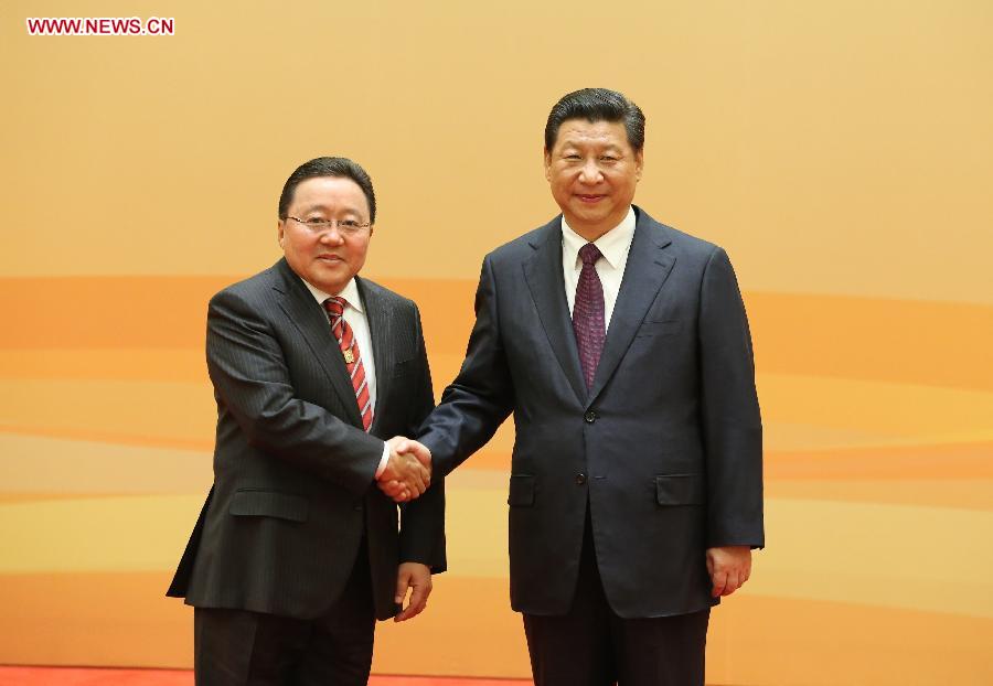 Chinese President Xi Jinping (R) shakes hands with Mongolian President Tsakhiagiin Elbegdorj during a Dialogue on Strengthening Connectivity Partnership in Beijing, capital of China, Nov. 8, 2014. (Xinhua/Ding Lin)