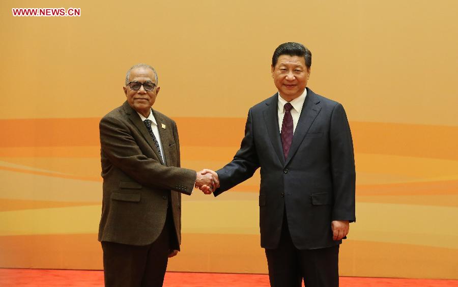 Chinese President Xi Jinping (R) welcomes Bangladeshi President Abdul Hamid to attend a Dialogue on Strengthening Connectivity Partnership in Beijing, capital of China, Nov. 8, 2014. (Xinhua/Ding Lin)