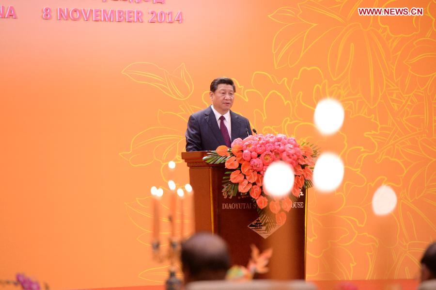 Chinese President Xi Jinping addresses a welcoming dinner for the Dialogue on Strengthening Connectivity Partnership in Beijing, capital of China, Nov. 8, 2014. (Xinhua/Wang Ye)