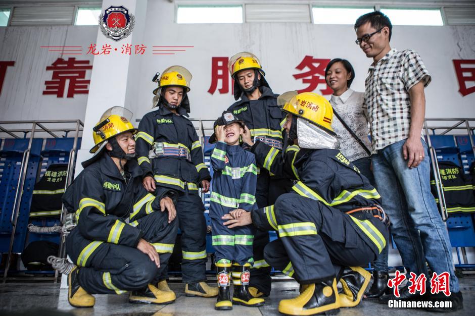 This group of photos is a birthday gift from the firefighters of Longyan Fire Department to Zhuang Yuming, who is a little fan of firefighters. In order to help Zhuang realize his dream, the firefighters decided to give him this special birthday present by making him mini firefighter uniform, and arranging a photo shoot with them in the fire department.