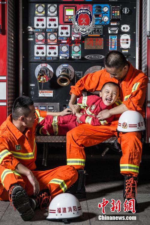 This group of photos is a birthday gift from the firefighters of Longyan Fire Department to Zhuang Yuming, who is a little fan of firefighters. In order to help Zhuang realize his dream, the firefighters decided to give him this special birthday present by making him mini firefighter uniform, and arranging a photo shoot with them in the fire department.