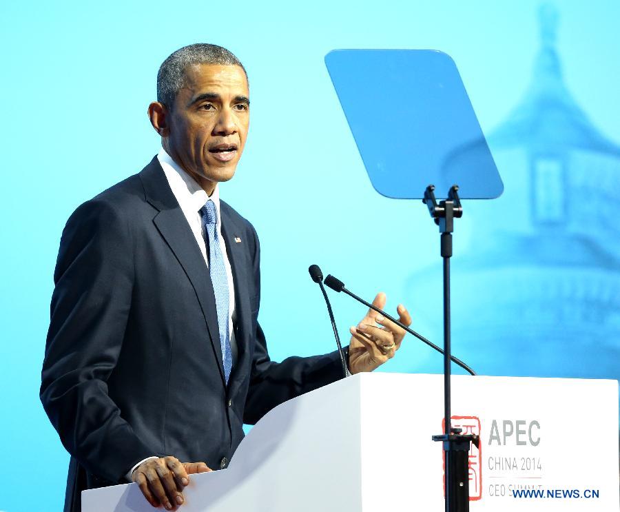 U.S. President Barack Obama delivers a keynote speech at the 2014 Asia-Pacific Economic Cooperation (APEC) CEO Summit in Beijing, capital of China, Nov. 10, 2014. (Xinhua/Chen Jianli)