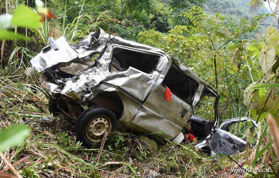 A damaged vehicle is seen at the road accident site in Du'an Yao Autonomous County, south China's Guangxi Zhuang Autonomous Region, Nov. 10, 2014. Nine people were killed and five others injured when the overloaded vehicle drove off a cliff here on Nov. 9. (Xinhua/Zhang Ailin)