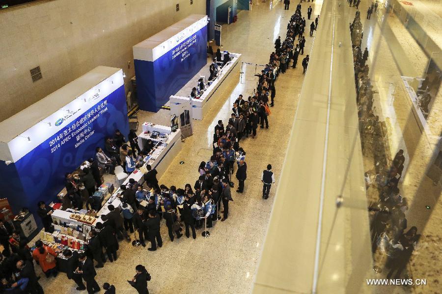 People wait to buy the first-day cover and commemorative stamps for the 22nd Asia-Pacific Economic Cooperation (APEC) Economic Leaders' Meeting at the China National Convention Center in Beijing, capital of China, Nov. 9, 2014. The first-day cover and commemorative stamps for the 22nd APEC Economic Leaders' Meeting are released here Sunday. (Xinhua/Zhang Yuwei)