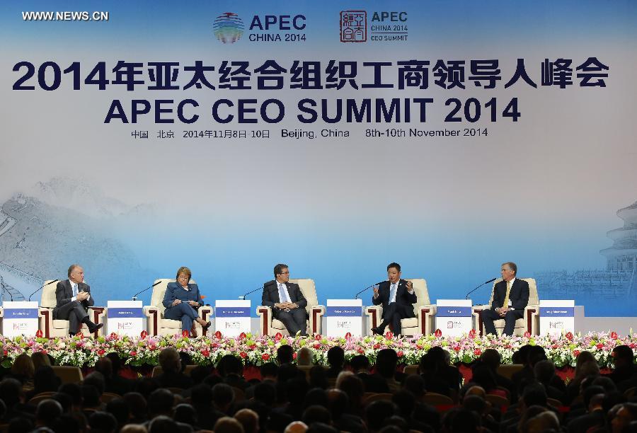 Dennis Nally, Global Chairman of PricewaterhouseCoopers International Ltd., Chilean President Michelle Bachelet, World Trade Organization (WTO) Director-General Roberto Azevedo, Frank Ning, Chairman of COFCO Corporation & APEC Business Advisory Council Chair 2014, and Caterpillar Chairman and CEO Douglas Oberhelman (L - R) attend a summit dialogue on Asia-Pacific economic integration and global multilateral trade system during the 2014 Asia-Pacific Economic Cooperation (APEC) CEO Summit in Beijing, capital of China, Nov. 9, 2014. The 2014 APEC CEO Summit opened in Beijing on Sunday. (Xinhua/Yin Gang)