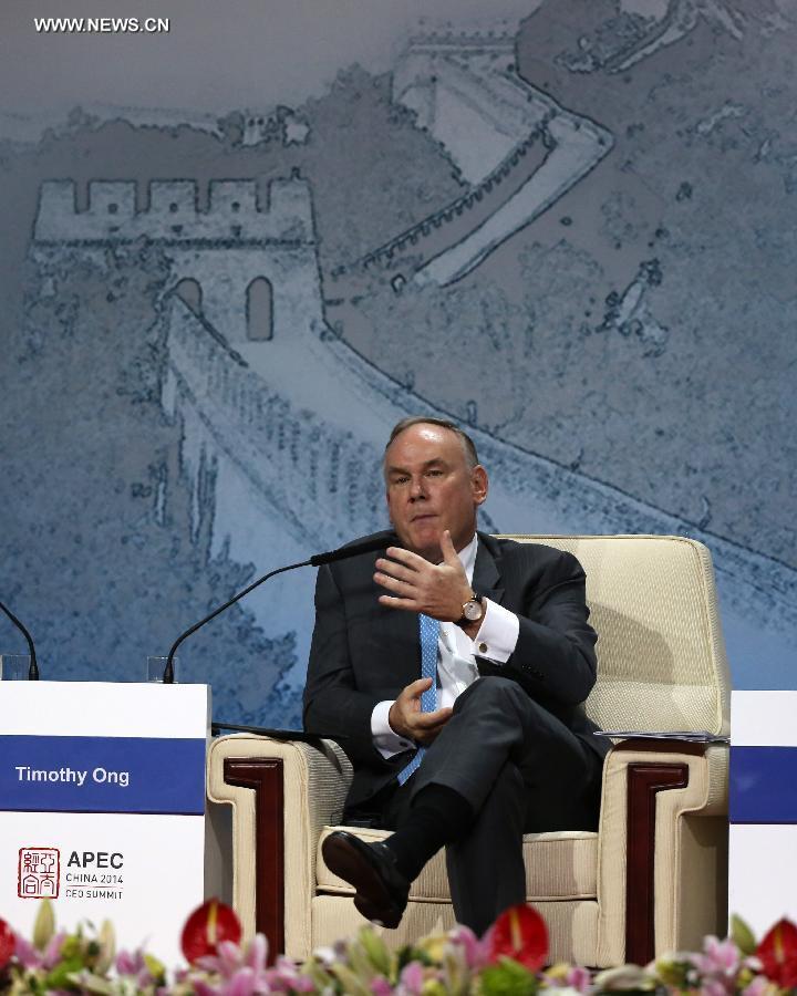 Dennis Nally, Global Chairman of PricewaterhouseCoopers International Ltd., attends a summit dialogue on Asia-Pacific economic integration and global multilateral trade system during the 2014 Asia-Pacific Economic Cooperation (APEC) CEO Summit in Beijing, capital of China, Nov. 9, 2014. The 2014 APEC CEO Summit opened in Beijing on Sunday. (Xinhua/Yin Gang)