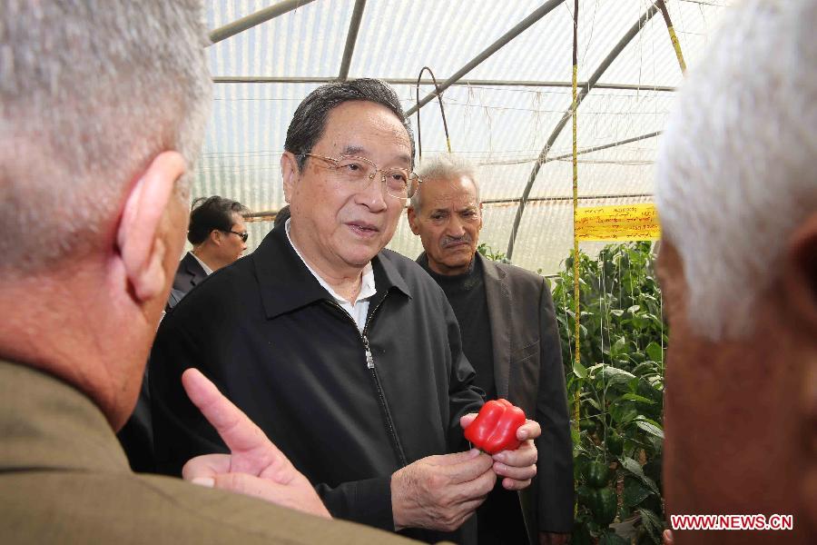 | Yu Zhengsheng (C), chairman of the National Committee of Chinese People's Political Consultative Conference (CPPCC), listens to an introduction at an agricultural cooperative during his visit to Jordan, Nov. 8, 2014. (Xinhua/Liu Weibing) |
