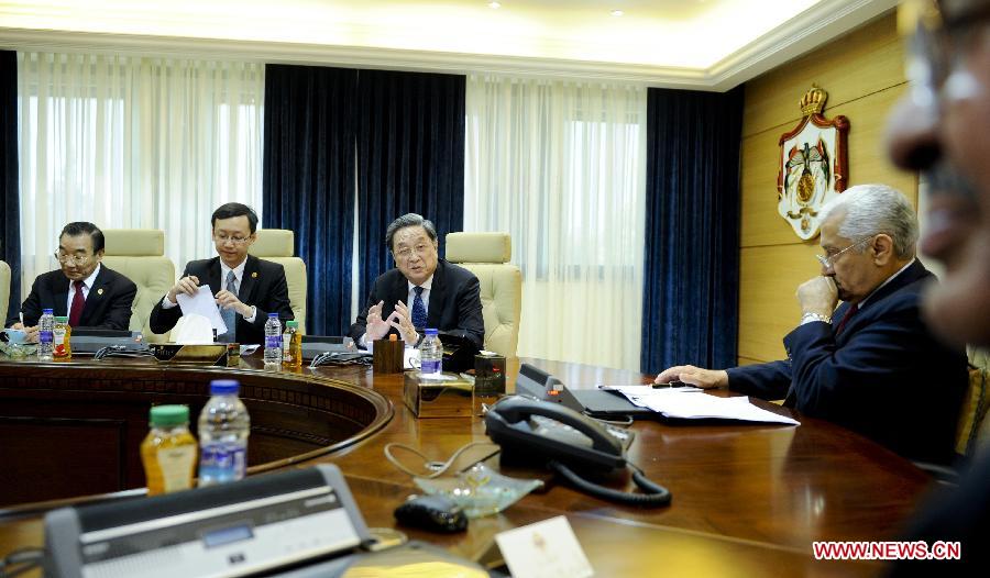 Yu Zhengsheng (3rd L), chairman of the National Committee of Chinese People's Political Consultative Conference (CPPCC), meets with Jordanian Prime Minister Abdullah Ensour (1st R) in Amman, Jordan, Nov. 9, 2014. (Xinhua/Zhang Duo)