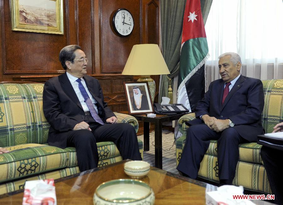 Yu Zhengsheng (L), chairman of the National Committee of Chinese People's Political Consultative Conference (CPPCC), meets with Jordanian Prime Minister Abdullah Ensour in Amman, Jordan, Nov. 9, 2014. (Xinhua/Zhang Duo)