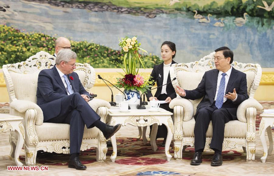 | Zhang Dejiang (R), chairman of the Standing Committee of the National People's Congress of China, meets with Canadian Prime Minister Stephen Harper at the Great Hall of the People in Beijing, capital of China, Nov. 9, 2014. (Xinhua/Xie Huanchi) |