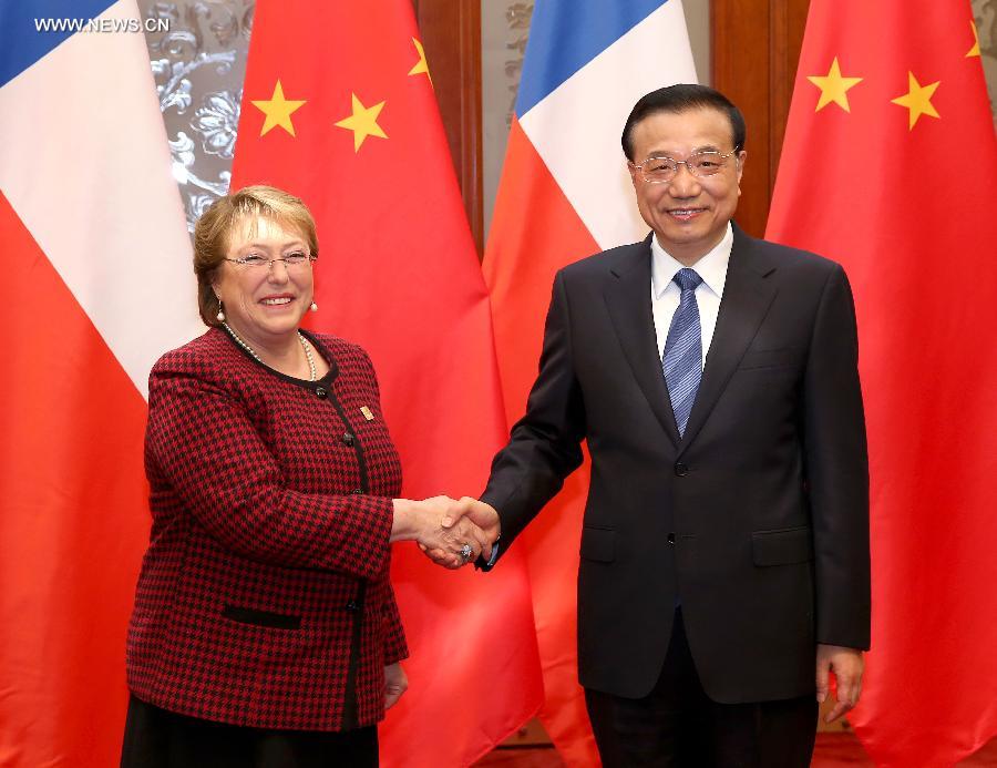 Chinese Premier Li Keqiang (R) meets with Chilean President Michelle Bachelet at the Great Hall of the People in Beijing, capital of China, Nov. 10, 2014. (Xinhua/Pang Xinglei)