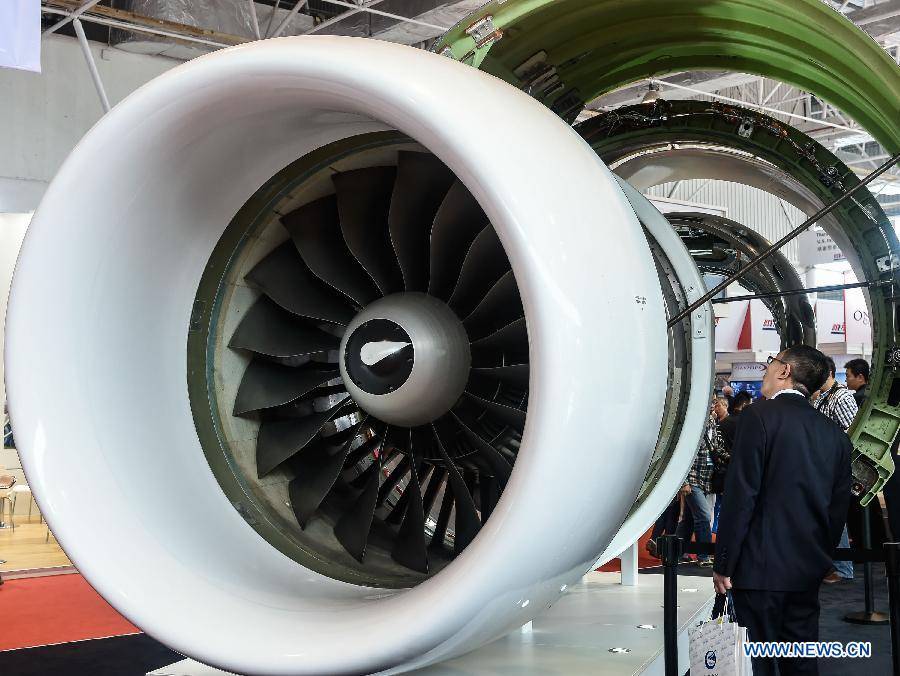 Visitors view the engine made by Hewlett-Packard (HP) at the 10th China International Aviation and Aerospace Exhibition in Zhuhai, south China's Guangdong Province, Nov. 11, 2014. Some 700 exhibitors at home and abroad with 130-plus planes attended the airshow from Nov. 11 to 16. (Xinhua/Liu Dawei)
